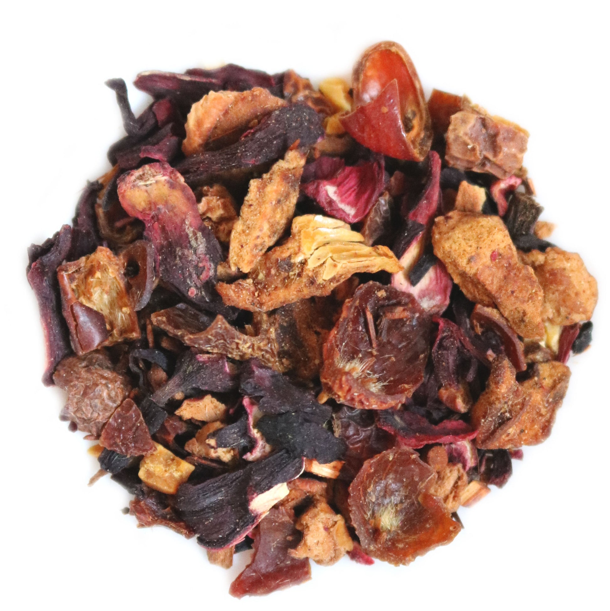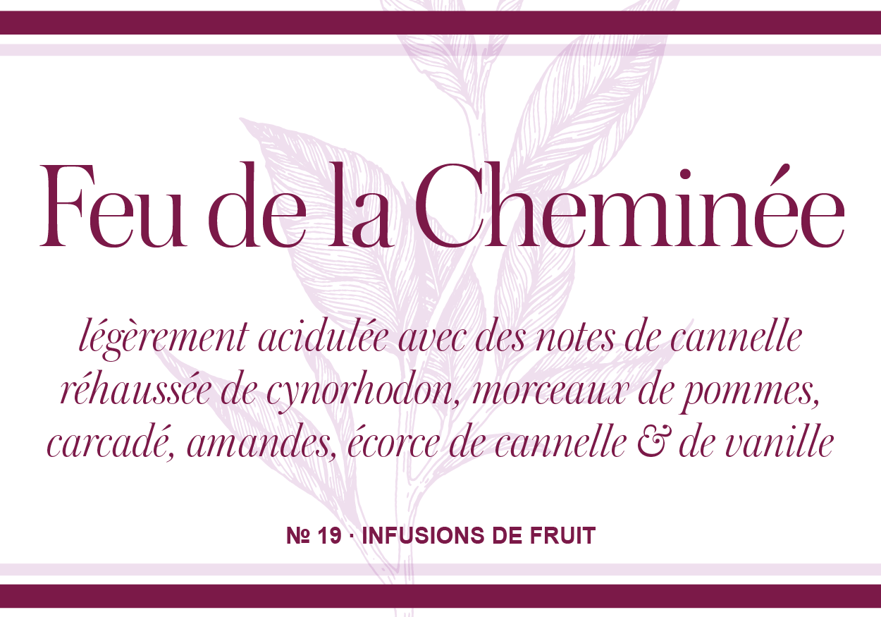Feu de la cheminée est une infusion réconfortante, où la douceur des pommes et des amandes se mêle aux notes chaleureuses de la cannelle et de la vanille. Légèrement acidulée grâce au cynorhodon et aux fleurs de carcadée, cette tisane évoque les soirs d’hiver passés au coin du feu.