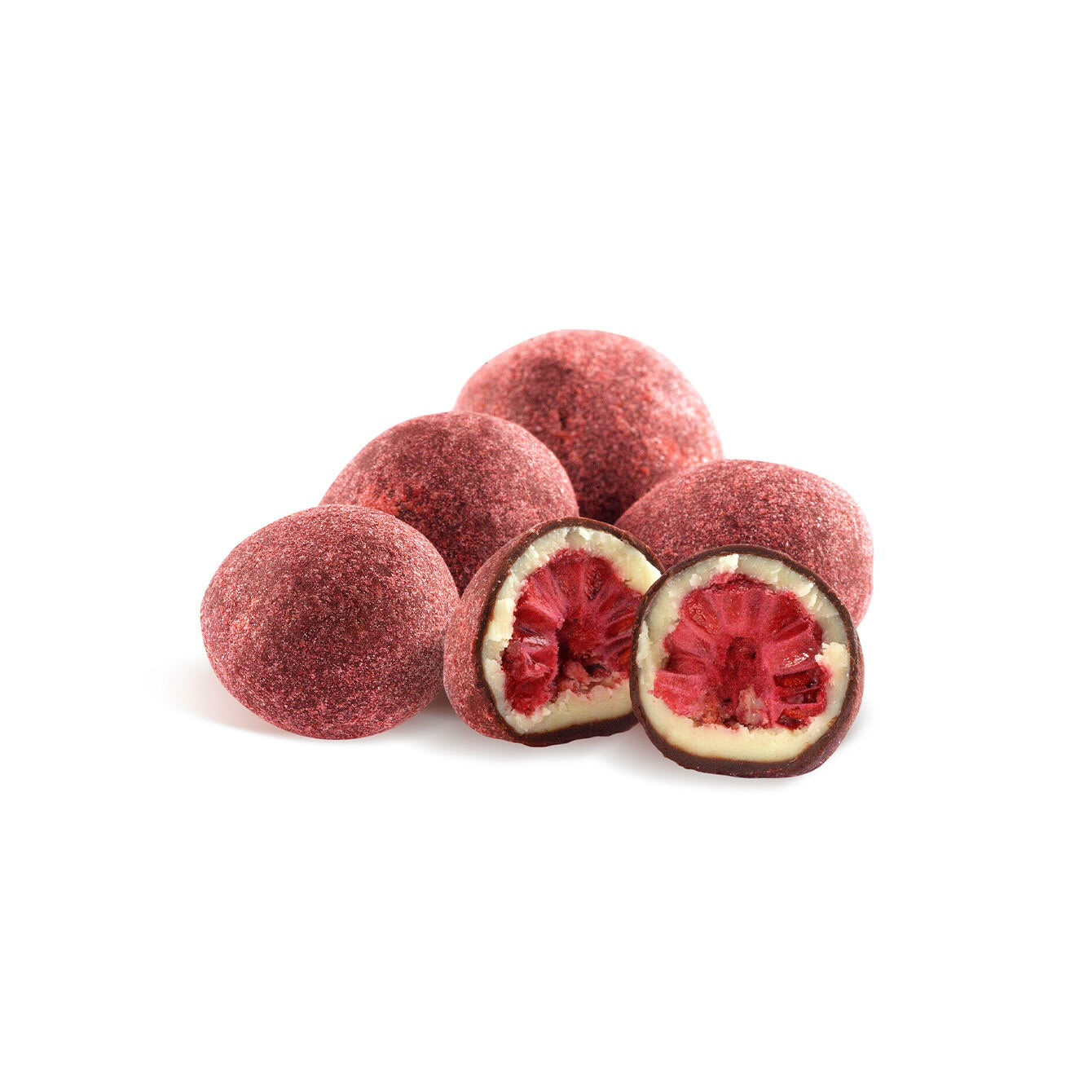 Ces petits bonbons aux framboises lyophilisées, recouverts de chocolat aux yaourt et au chocolat noir, sont parfaits pour un moment de douceur acidulée.