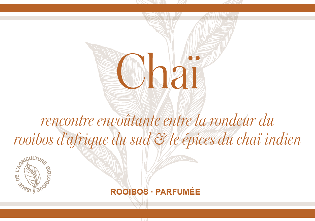 Le Rooibos Chaï est une infusion généreuse et chaleureuse qui marie la douceur naturelle du rooibos d’Afrique du Sud aux épices traditionnelles indiennes. Un mélange bio aux notes de gingembre, cannelle, cardamome et clou de girofle, pour une tasse riche et réconfortante, sans théine.