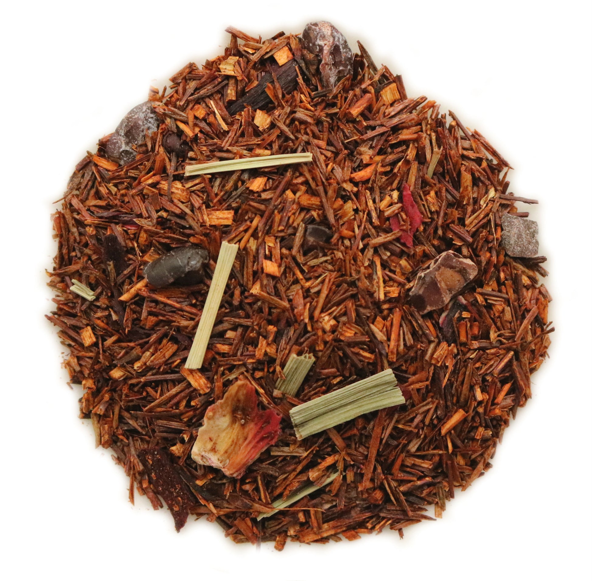 Rooibos mit Zitrusgeschmack, gehacktem Zitronengras, Schokolade und Carcadéstücken. Sehr erfrischender Aufguss. Angebaut in Südafrika, in der Kapregion. Ohne Thein enthält dieser Aufguss sehr wenig Tannin.